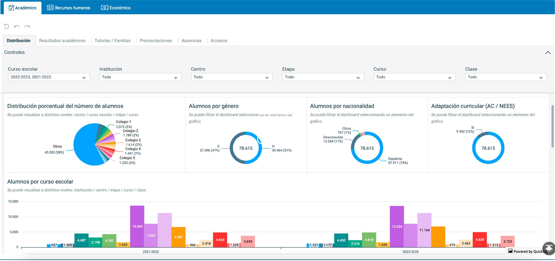 En el panel Académico, puedes consultar y exportar los datos sobre la distribución de los diferentes alumnos, los resultados académicos, los datos sobre las tutorías y familias, los detalles de las preinscripciones, información sobre las ausencias y los accesos a la plataforma. Puedes aplicar múltiples filtros por cada apartado como: